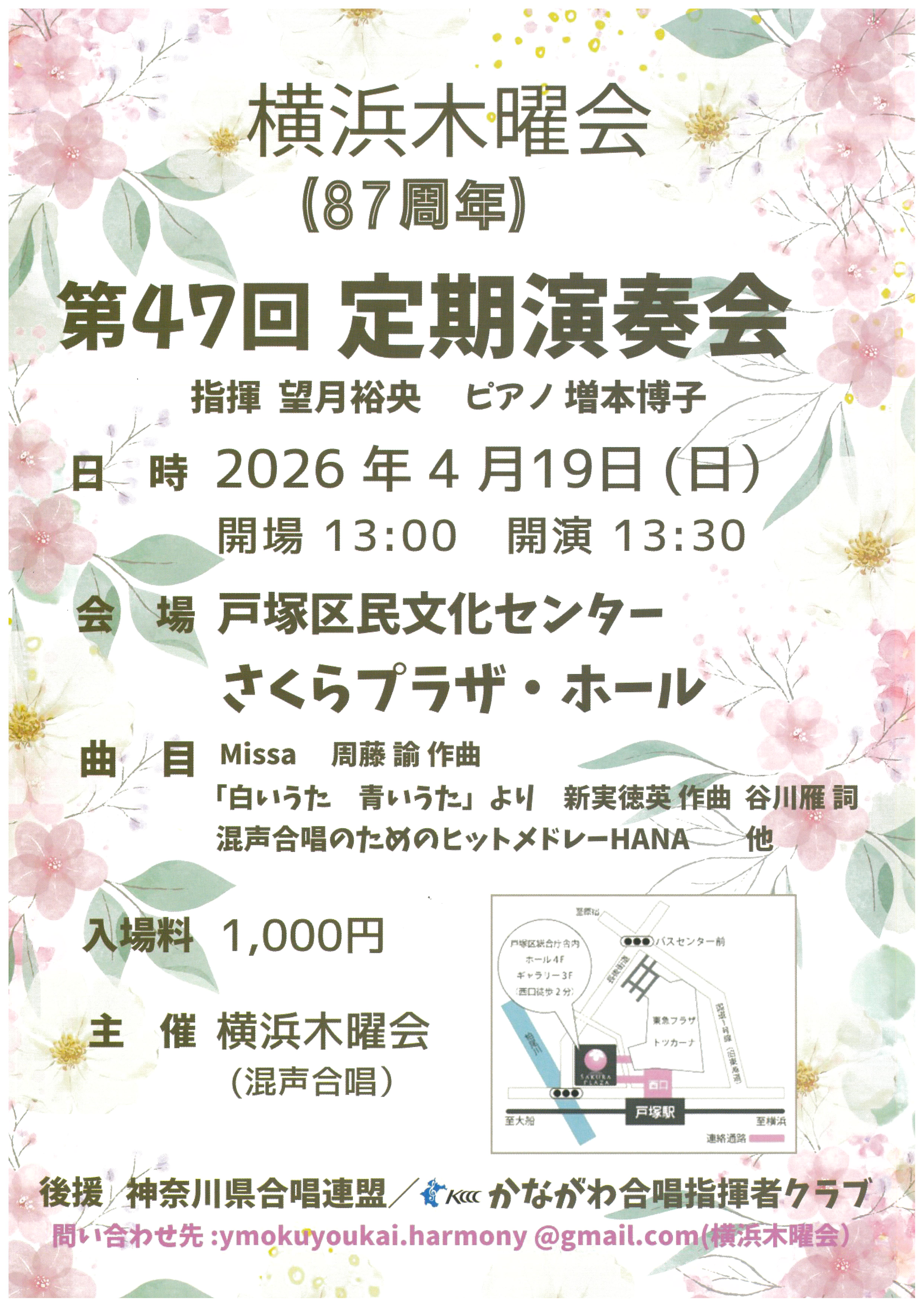 【会場】戸塚区民文化センターさくらプラザ・ホール 【出演】望月 裕央(指揮)、増本 博子(ピアノ) 他 【チケット料金】全席自由 1,000円 【お申込・お問合せ】横浜木曜会 Mail:ymokuyoukai.harmony@gmail.com |
