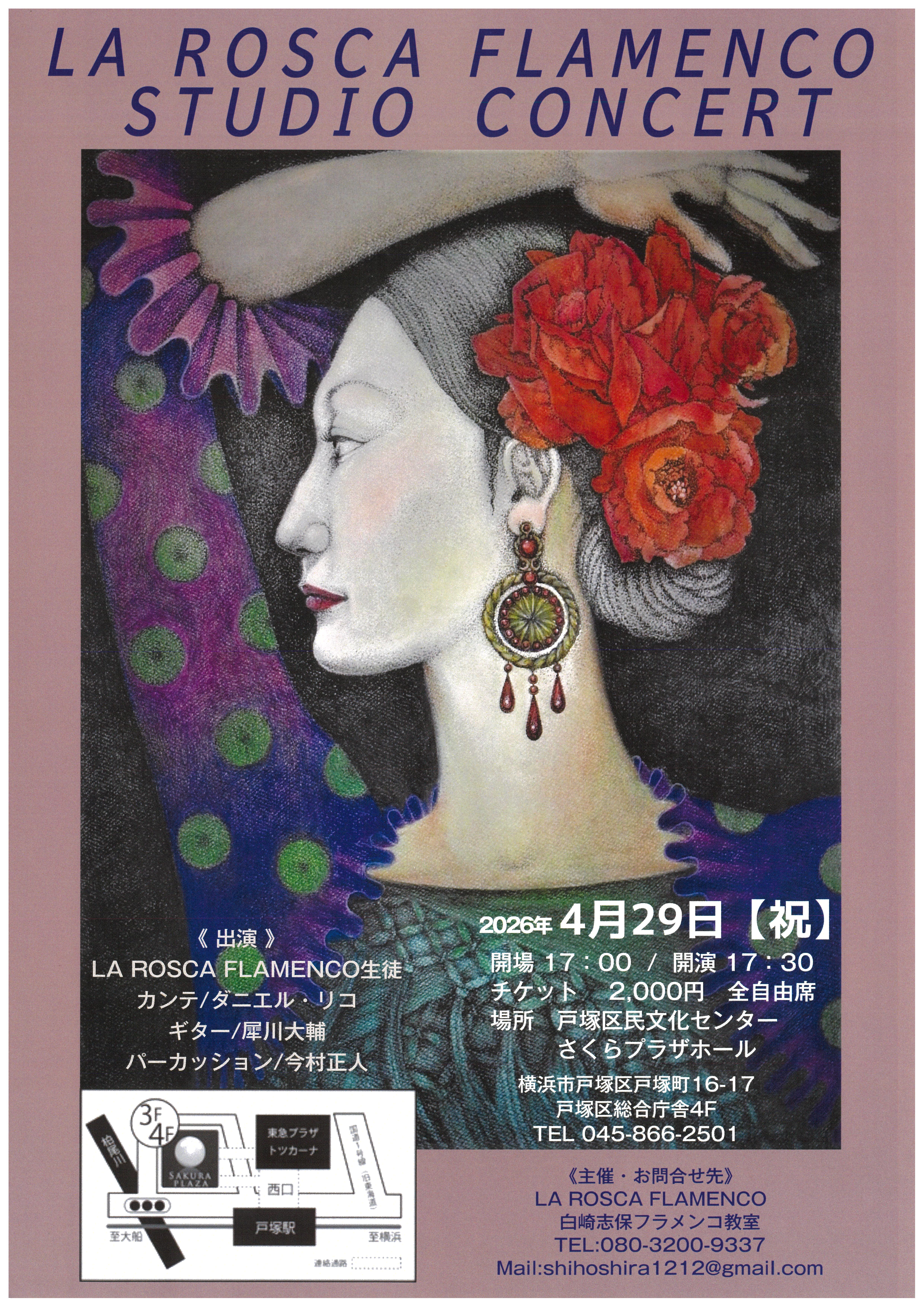 【会場】戸塚区民文化センターさくらプラザ・ホール 【出演】LA ROSCA FLAMENCO生徒、ダニエル・リコ(カンテ)、犀川 大輔(ギター)、今村 正人(パーカッション) 【チケット料金】全席自由 2,000円 【お申込・お問合せ】LA ROSCA FLAMENCO 白崎志保フラメンコ教室 電話:080-3200-9337 Mail:shihoshira1212@gmail.com |